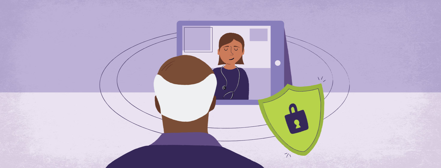 a man talking to his doctor on an iPad with a circle around them connected by a shield with a lock on it