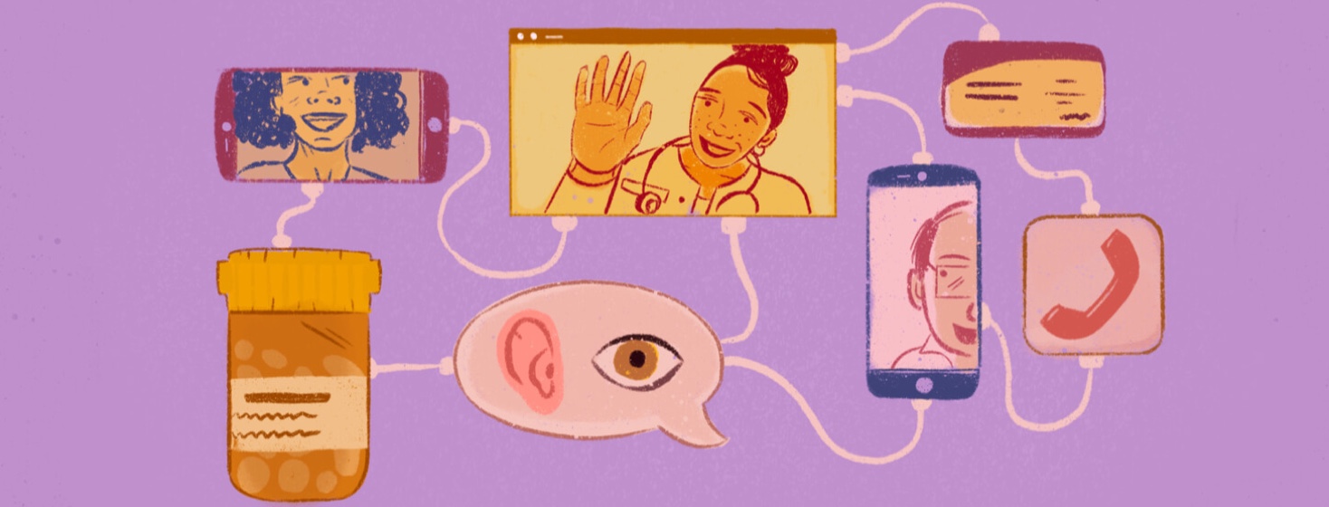 a cell phone, a computer screen, a bottle of pills, a speech bubble, an app, and a card all connected by wires and showing virtual medicine show